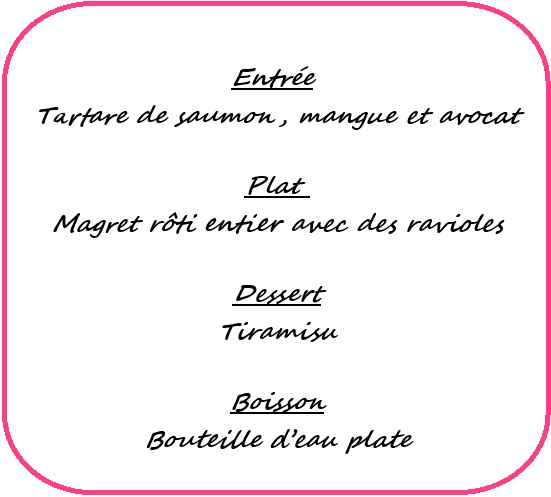 Il est 19 heures. Nous voici installé(e) à la terrasse du restaurant Le Victor Hugo à Valence. Notre choix est fait. En voici le détail :